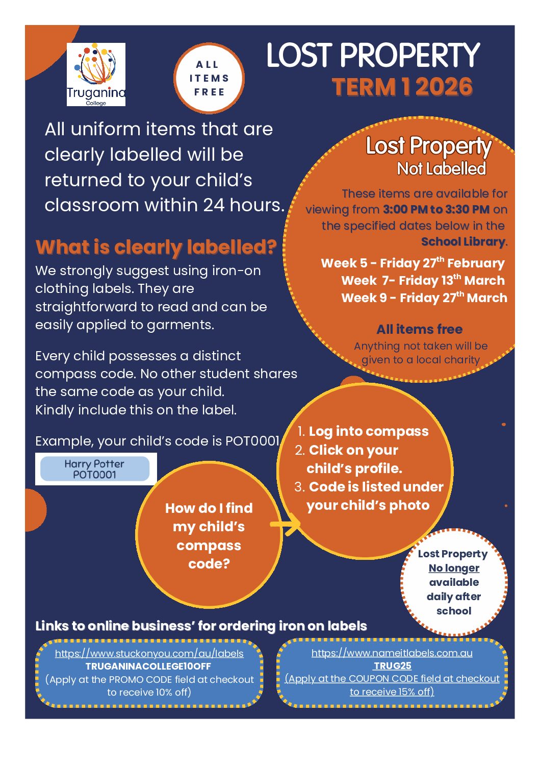 Making sure all items are clearly labelled is the only way for them to be found or returned to you. Please do not bring valuables to school that are easily lost or cannot be labelled.